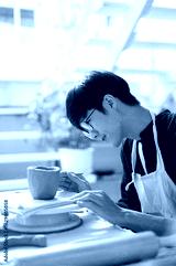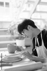 Pottery artist holding brush marking clay mug to glue a handle at working table in a class or studio