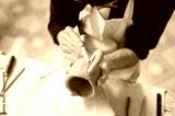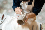 Young pottery artist using a modeling tool to smooth a clay mug at working table in class or studio