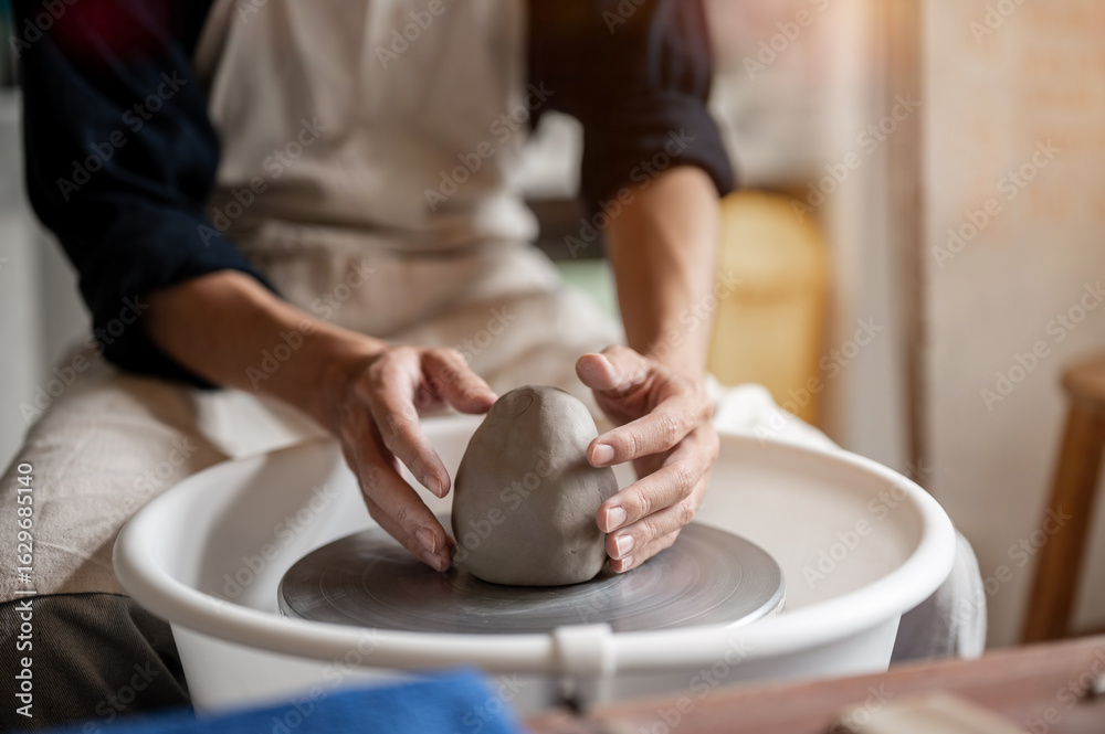 Close up of pottery artist's hands putting a clay body on spinning throwing wheel in class or studio