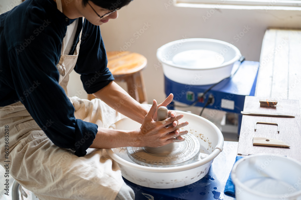 Young pottery artist's with stained hands molding a clay on spin throwing wheel in a class or studio