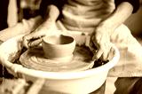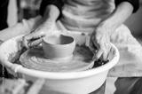 Close up potter using wire cutter on clay bowl for tea brewing on throwing wheel in class or studio.