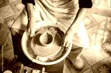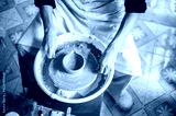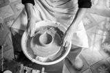 Pottery artist using wire cutter on a clay bowl for tea brewing on throwing wheel in class or studio.