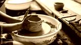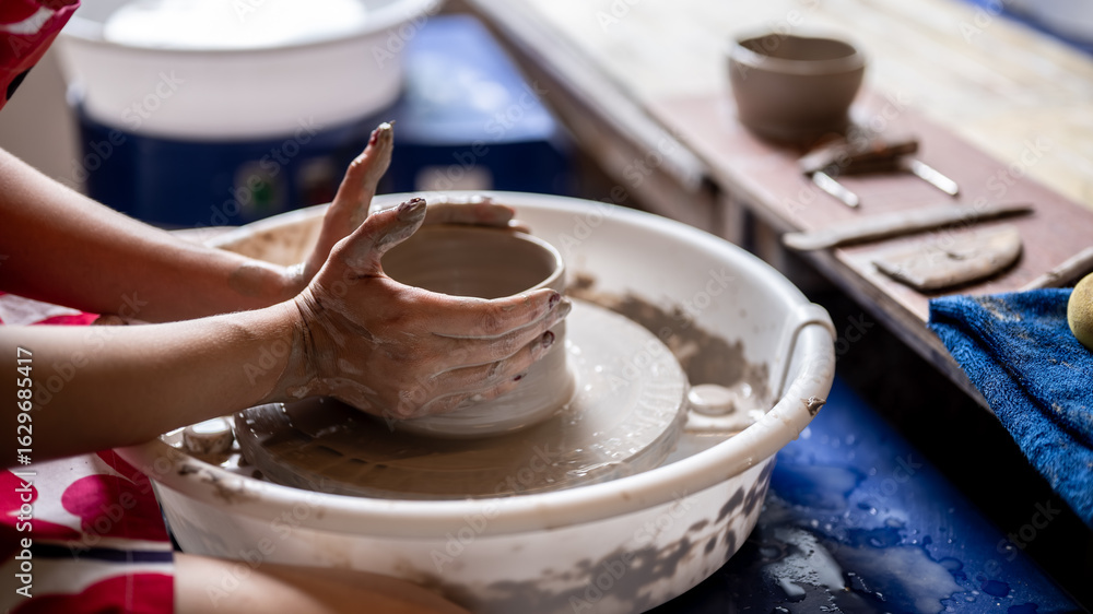 Close up painted nails woman pottery artist molding a clay bowl on throwing wheel in class or studio