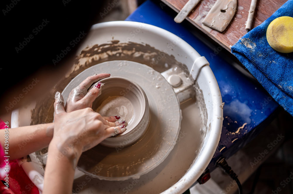 Red painted nails woman pottery artist molding a clay bowl on spin throwing wheel in class or studio