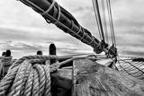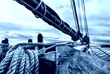 Sailboat close up on open water. Lots of great texture of ropes, rigging, wood, bow, boom of this tall ship schooner at sea in stormy weather.