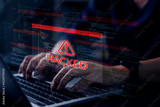Hacked alert on laptop screen with a cyber criminal typing code. Data security breach, digital crime and identity theft. hacking, cybercrime, phishing, and online cybersecurity and data protection.