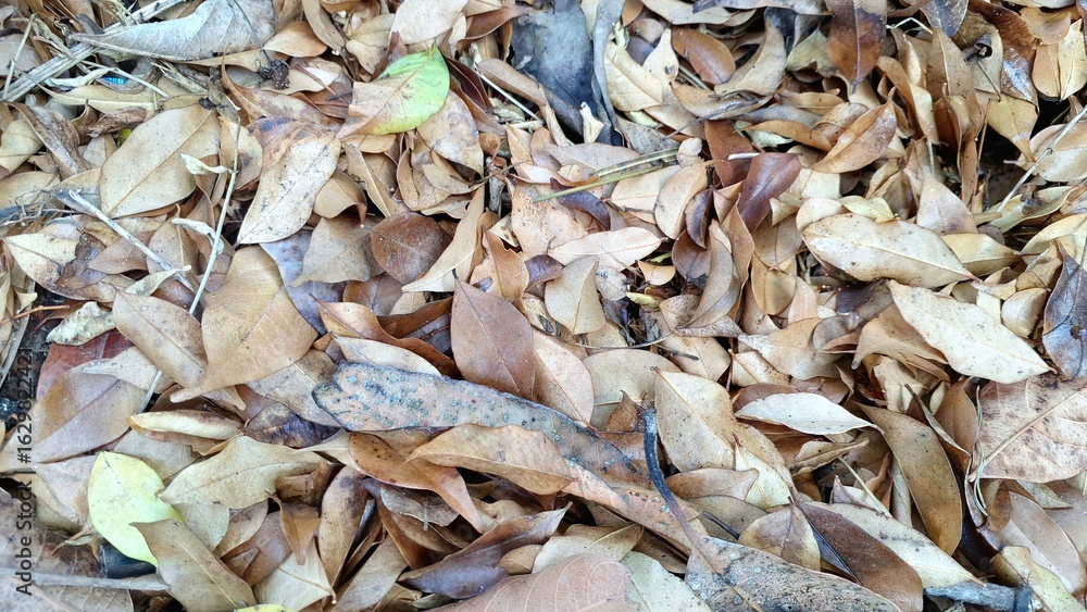 Close-up Texture of Dry and Dead Leaves Scattered on the Ground in a Woodland Setting