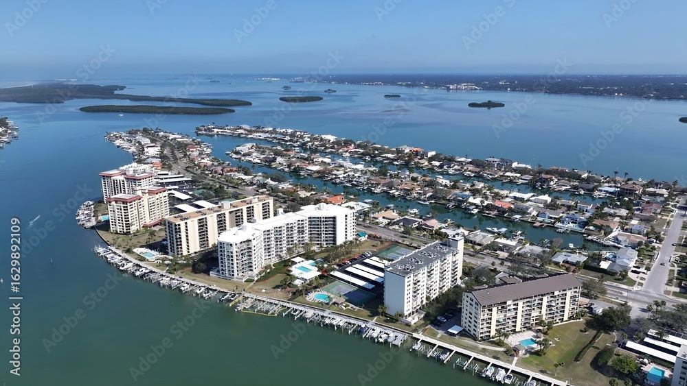 Clearwater Beach Skyline In Clearwater Florida United States. Stunning Tropical Coastline Beach Scene Viewed From Above. Coast Horizon Seaside Summertime. Seaside Beach Panning Wide.