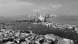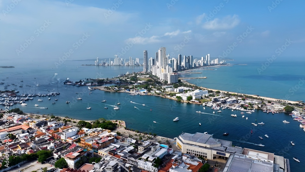 Cartagena Skyline In Cartagena De India Bolivar Colombia. Aerial View Of Stunning Beach With Crystal Clear Waters. Business Clouds Sky Downtown Cityscape. Backgrounds Panoramic.