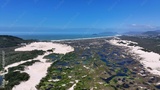Joaquina Dune In Florianopolis Santa Catarina Brazil. Breathtaking Aerial View Of A Lush Tropical Coastline Scenery. Coast Horizon Seaside Summertime. Coast Outdoors Panoramic.