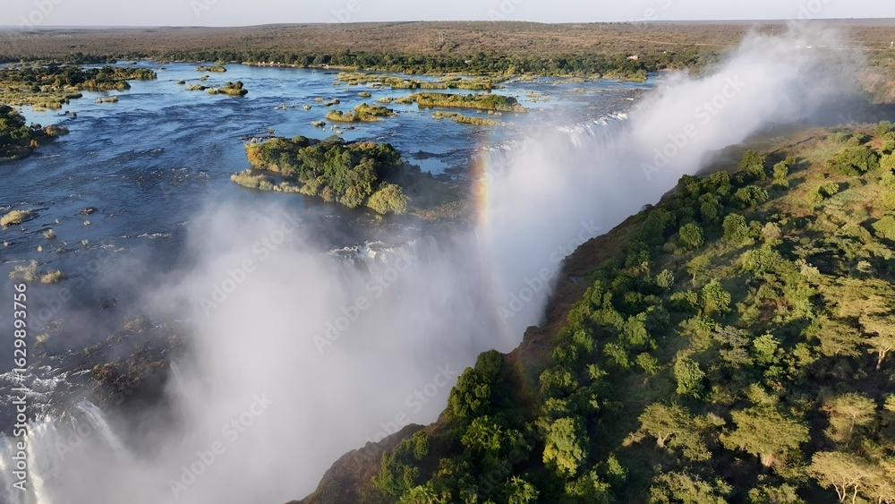 Rainbow In Waterfall In Victoria Falls Matabeleland North Zimbabwe. Rainbow Forming Over Waterfalls With River In Background. Nature Clouds Sky Mountain Canyon. Nature Panoramic.