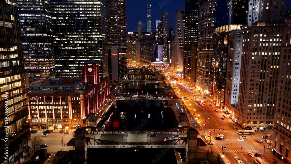 Chicago Skyline In Chicago Illinois United States. Amazing Skysrapers And Traffic On Street Viewed From Above. Building Metropole Skyline Buildings Beautiful. Buildings Flyover Night.