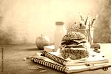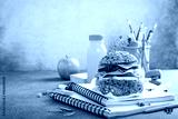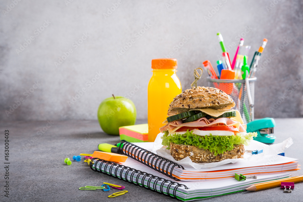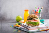 Healthy lunch for school with sandwich, fresh apple and orange juice. Assorted colorful school supplies. Copy space.