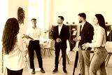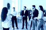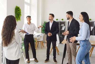 Portrait of a group of young confident business people standing in modern office discussing job project or startups. Coworkers and company employees talking with colleague on a meeting.
