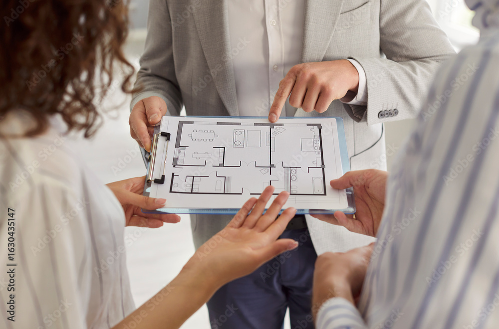 Cropped shot of real estate agent showing flat plan on clipboard to potential buyers. Male realtor and young couple discussing layout of new apartment or house during real estate consultation.