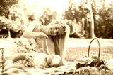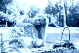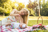 Mom playing with her baby girl while having a picnic together in the park.