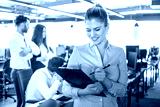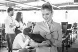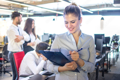 Young smiling businesswoman with clipboard and pen standing in modern office.