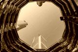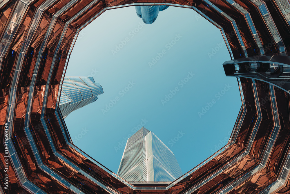 Symmetrical upward view from inside The Vessel, looking at its futuristic honeycomb structure against a blue sky in Hudson Yards, NYC.
