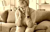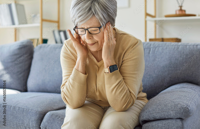 Tired frustrated old senior woman touching head, feeling headache, migraine, sitting on couch alone depressed after loss, grief, trauma, nervous breakdown, physical, mental or emotional problems