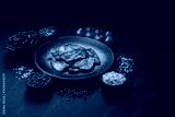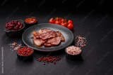 Cooked fried crispy bacon as an ingredient of a delicious English breakfast. Pieces of fried bacon