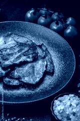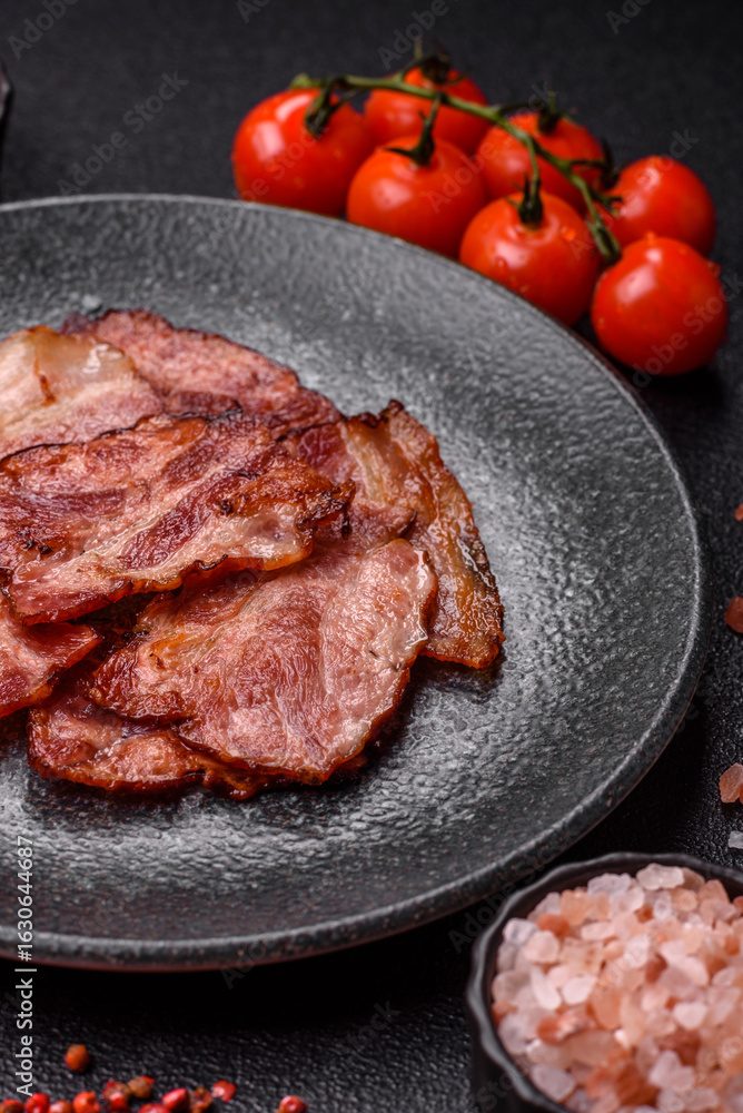 Cooked fried crispy bacon as an ingredient of a delicious English breakfast. Pieces of fried bacon