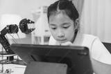 Focused child learning to code on a tablet. Digital literacy and robotics.