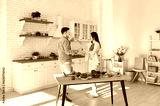 Happy family couple dancing together in the kitchen while cooking food at home. Enjoy a fun and joyful moment, housework with entertainment, positive lifestyle in a warm domestic setting.
