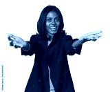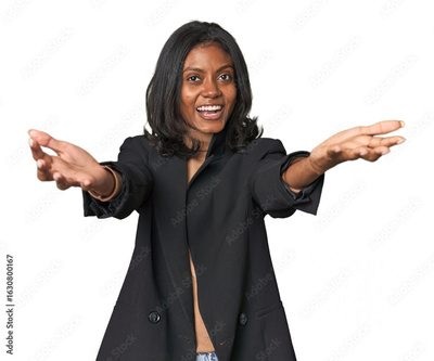 Young Indian woman in business suit feels confident giving a hug to the camera.
