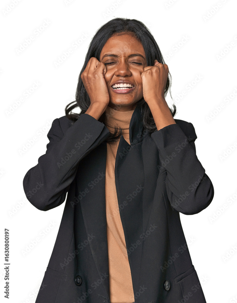 Young Indian woman in business suit crying, unhappy with something, agony and confusion concept.