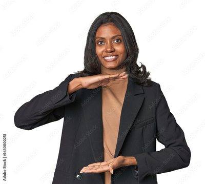 Young Indian woman in business suit holding something with both hands, product presentation.