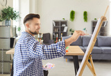 Young artist man dressed casually sits alone in modern living room, holding drawing pallete and painting pictures on easel, spend weekend leisure, enjoy favourite creative hobby at home.