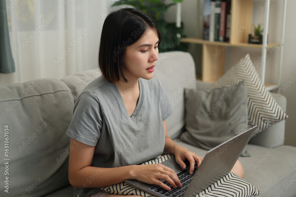 Top view, Young Asian woman in casual clothes using laptop while sitting on sofa in cozy living room. Work from home, Remote working.