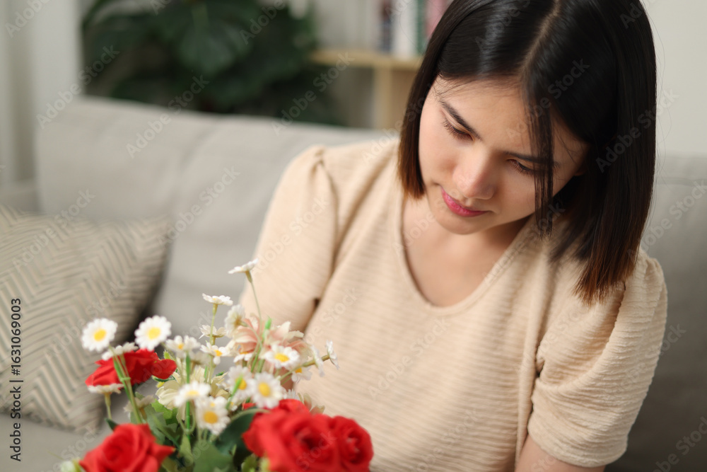 Selective focus shot, Happy young woman is enjoying arranging flowers in a vase in living room at home. Enjoying Weekend.