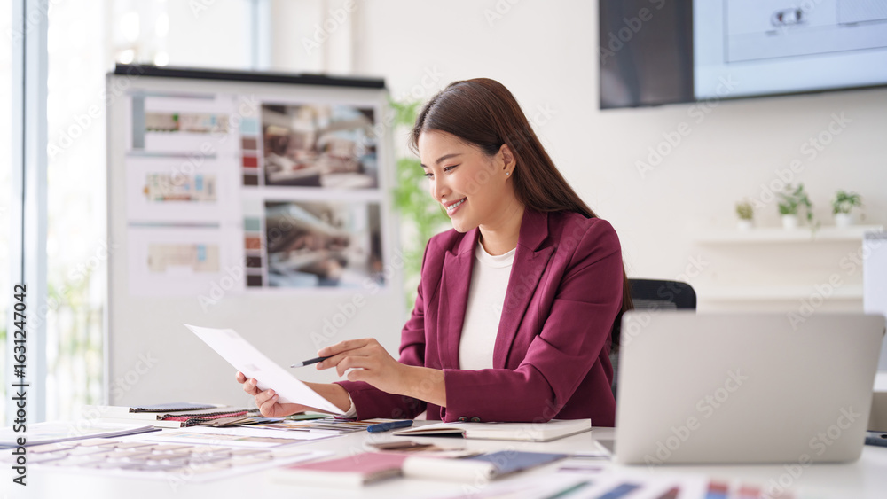 Asian adult architect professional review building plans design project modern office workspace interior property development solution