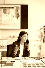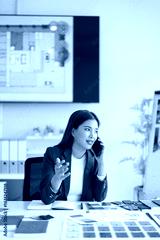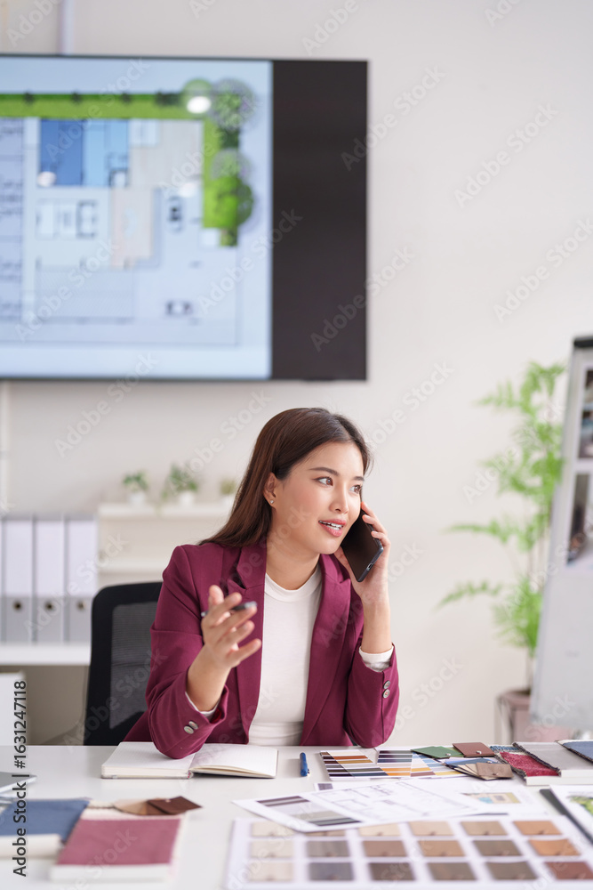 Asian woman architect discusses project details phone modern office property development interior design plans