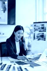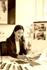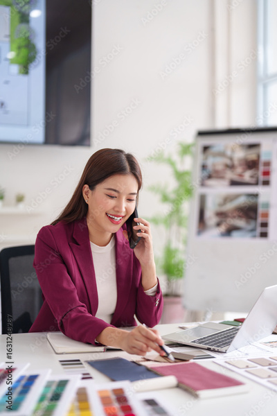 Asian female professional conducts design consultation discusses material samples for home interiors