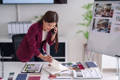 Asian adult architect woman plans creative interior design concepts in modern office discuss new home projects with clients