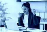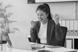Asian adult woman real estate agent celebrates major sales success closing deal using laptop computer at modern office desk property investment achievement