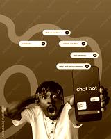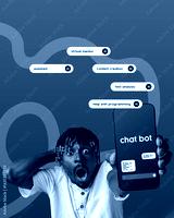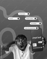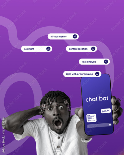 Surprised individual showcases a chatbot on a vibrant purple background related to AI assistance and content creation