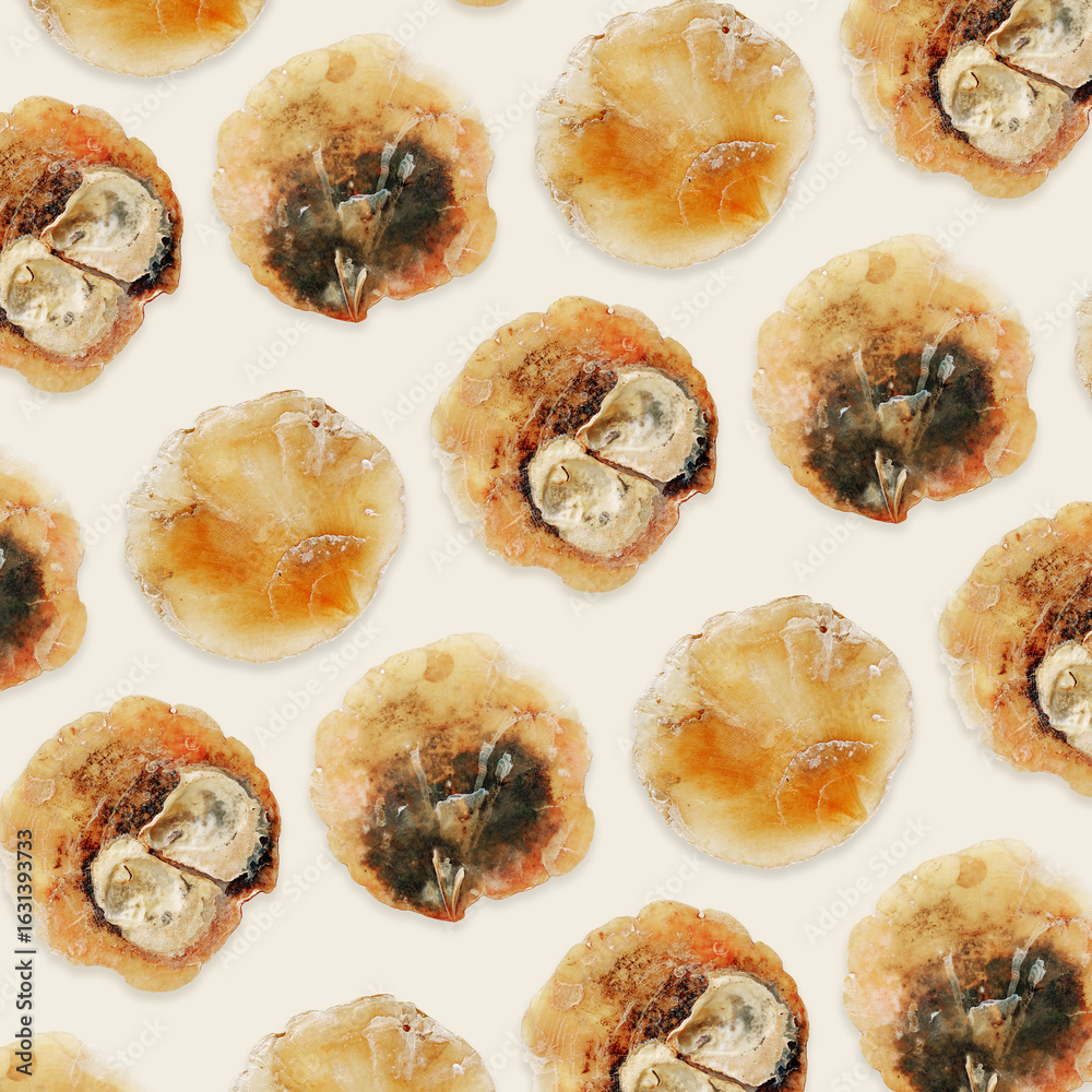Minimal style nautical pattern with Anomia shells, creative Summer still life beige monochrome background with natural yellow golden seashells, marine life nature design, repeat graphic pattern