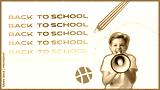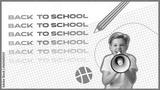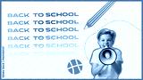 Cheerful boy using megaphone to announce back to school event with colorful background and playful design elements