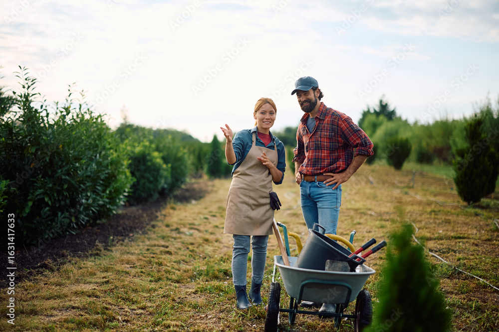 Happy plant nursery owners talking while taking care of tree seedlings.