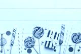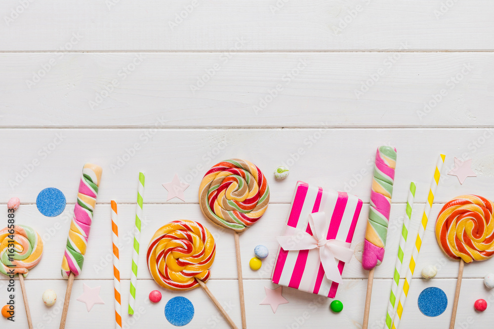 Collection of birthday party objects with gift box. Valentines day gift box. Top view flat lay with copy space