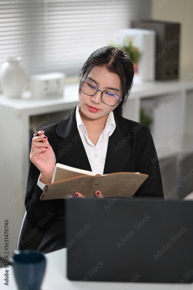 Businesswoman reading notes in a notebook and planning tasks in a modern office