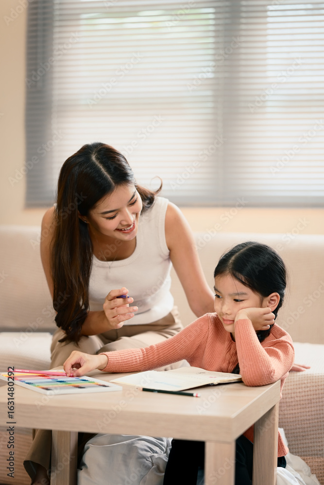 Caring mother supporting her daughter who appears tired or frustrated with her studies