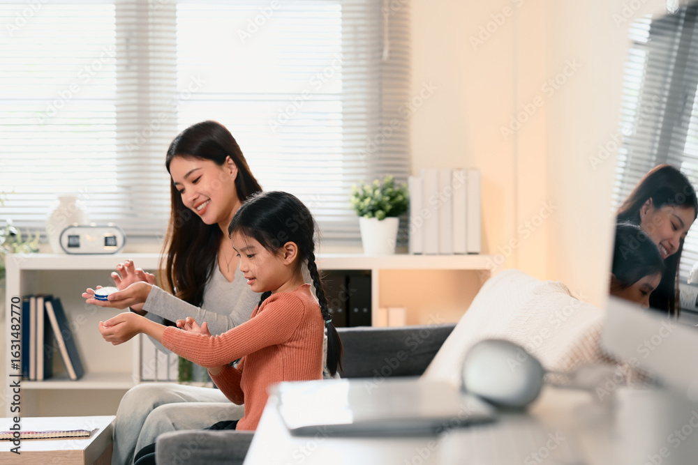 Happy asian mom assisting daughter with skincare application at home