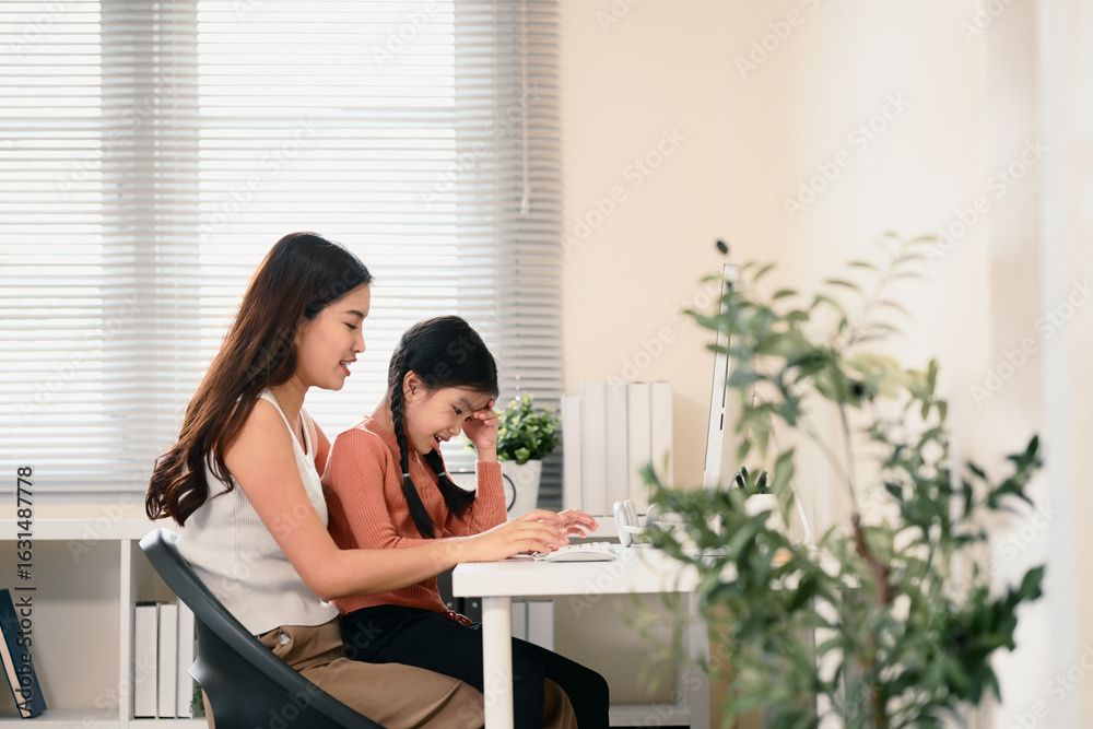 Smiling mom and daughter learning Chinese characters at home during an online language class