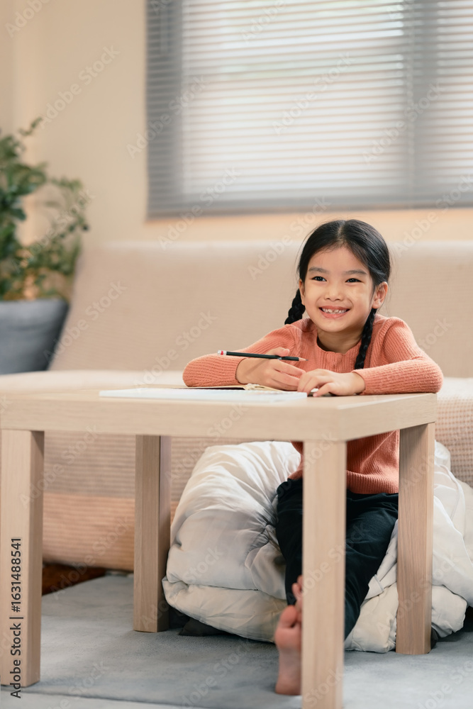 Cute elementary school girl doing school assignments on the floor with notebooks
