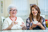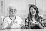 Portrait of a grandma and her granddaughter drinking coffee and talking at home.