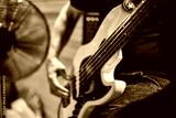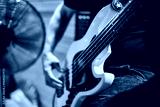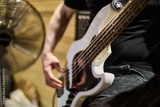 Close-up of young adult white male playing electric bass guitar. Warm lighting and fan create lively atmosphere. His fingers move skillfully on strings, capturing essence of band rehearsal